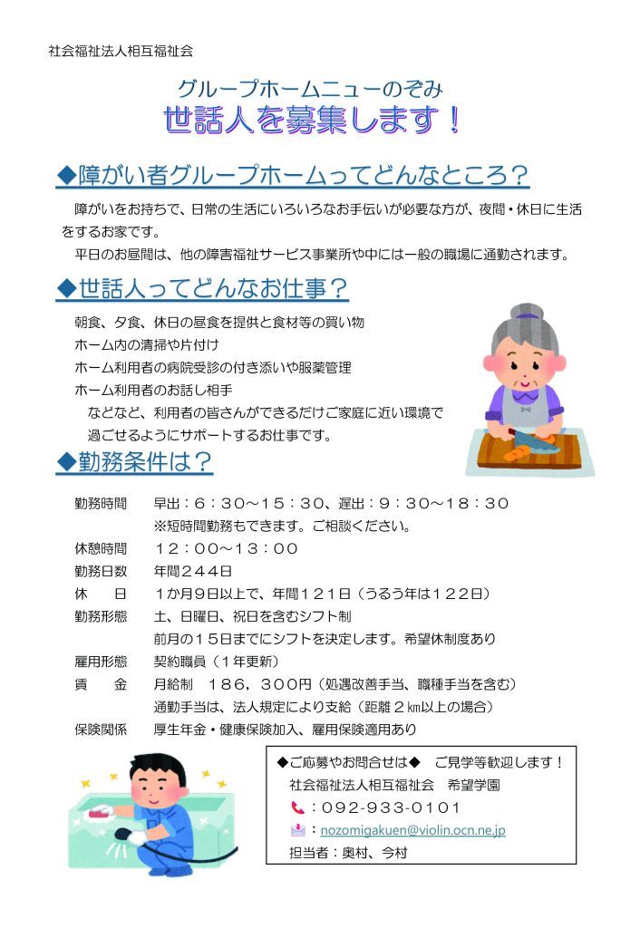 現在、当法人の施設「グループホームニューのぞみ」では、「世話人」の採用を募集中です! グループホームの皆さんができるだけご家庭に近い環境で過ごせるようにサポートするお仕事です♪ お問い合わせ・見学だけでもお気軽にご連絡ください!お仕事内容・勤務条件などの詳しい内容は以下をご覧ください。