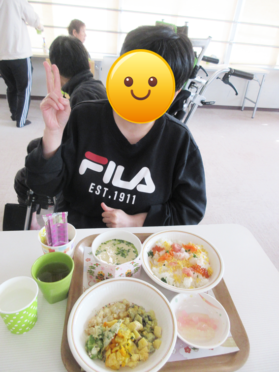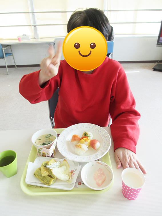 ▼昼食はちらし寿司、手毬寿司、天ぷら盛り合わせ、茶碗蒸し等を頂きました!お菓子やデザートのケーキもみんなで楽しみました!スタッフから福袋のプレゼントがあり、利用者さんたちは笑顔の時間を過ごされていました。